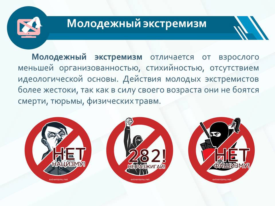 На сегодняшний день экстремизм является реальной угрозой национальной безопасности Российской Федерации. Наблюдается увеличение неформальных молодежных движений экстремистской направленности. В настоящее время членами неформальных молодежных организаций (группировок) экстремистско-националистической направленности являются молодые люди в возрасте от 14 до 30 лет, нередко - несовершеннолетние лица 14 – 18 лет.