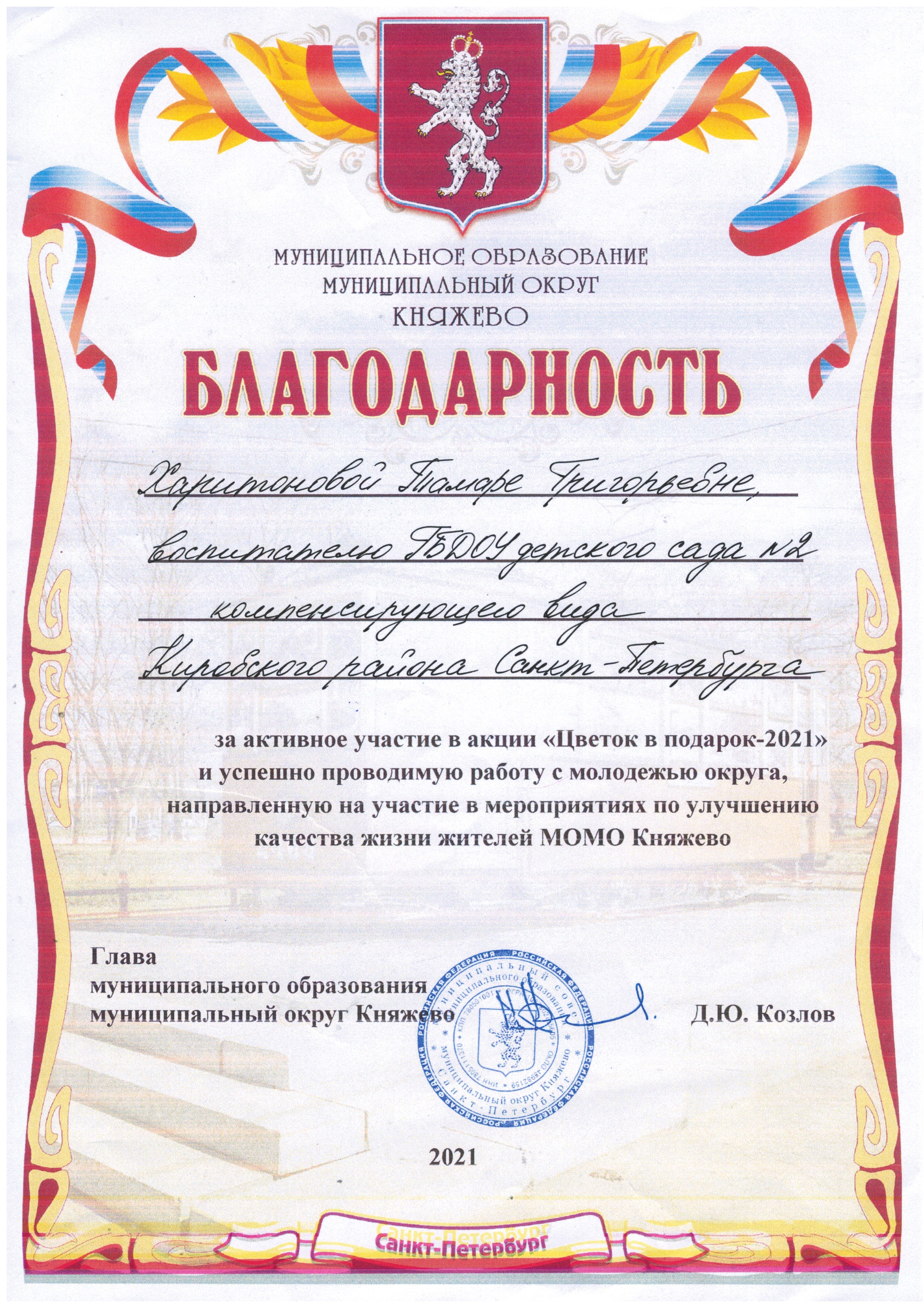 2021 - благодарность от главы муниципального образования муниципального округа Княжево Д.Ю. Козлова за активное участие в акции «Цветок в подарок-2021» и успешно проводимую работу с молодежью округа, направленную на участие в мероприятиях по улучшению качества жизни жителей МОМО Княжево