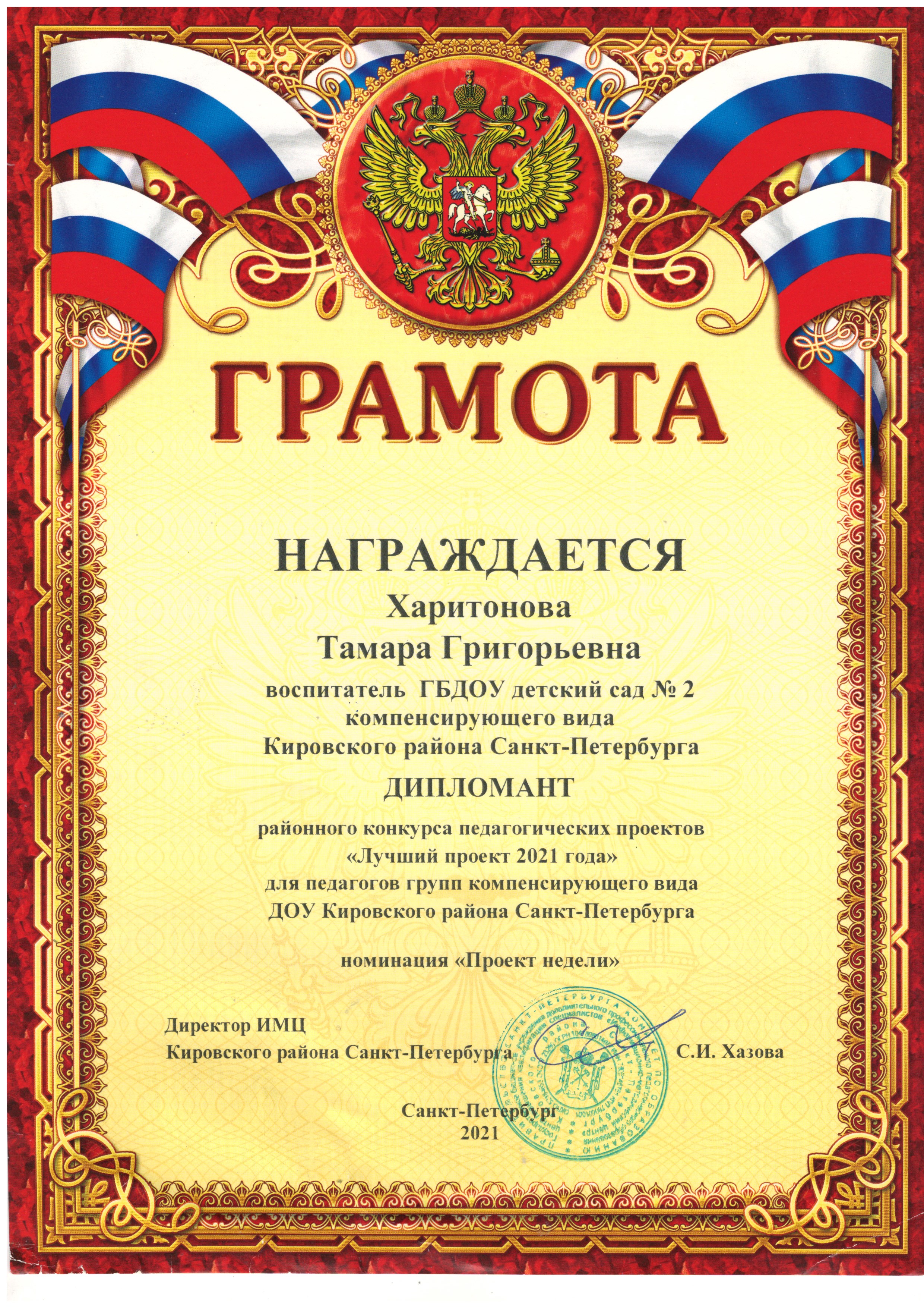 2021 - дипломант районнного конкурса педагогических проектов «Лучший проект 2021 года» для педагогов групп компенсирующего вида, ИМЦ Кировского района