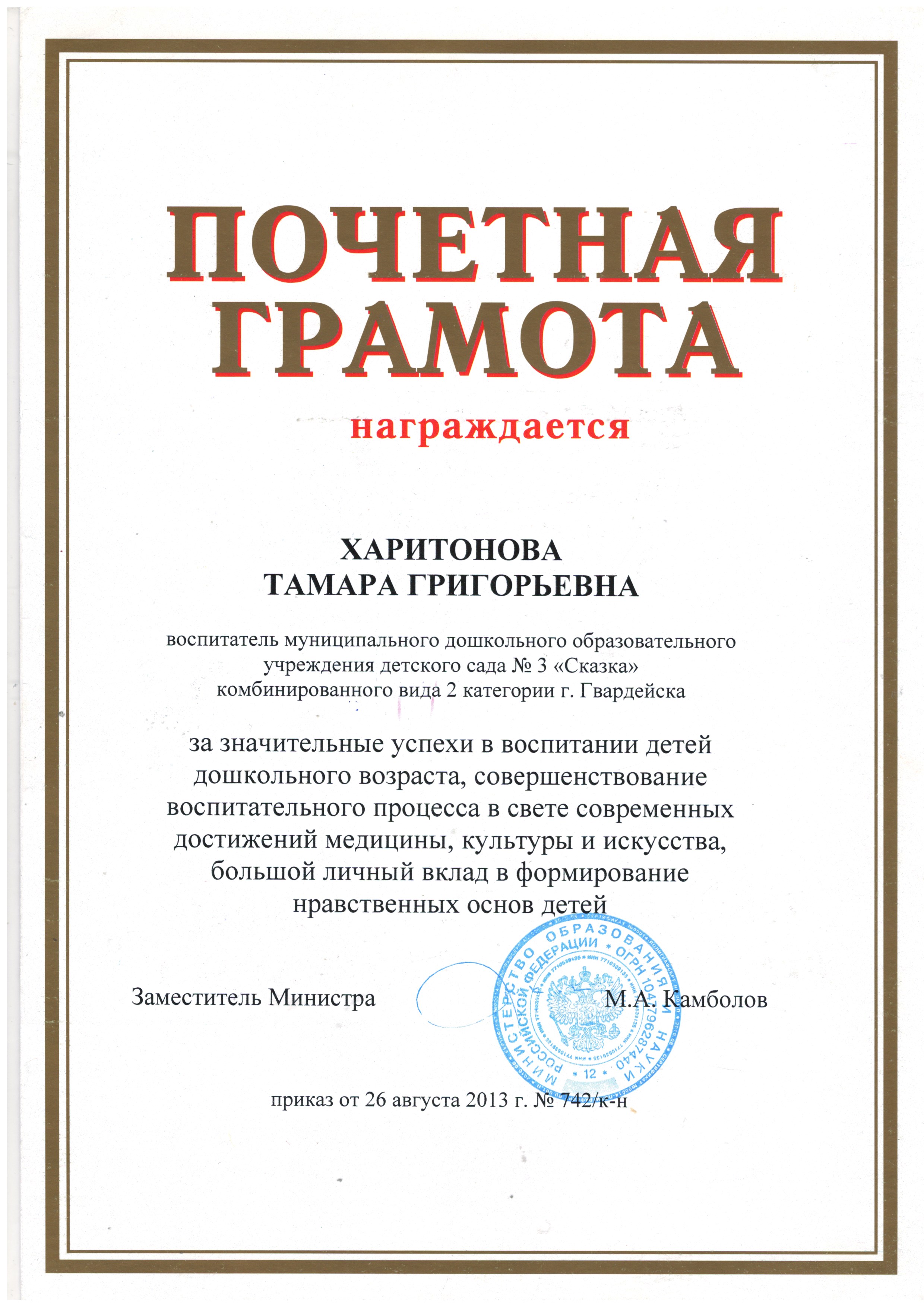 26.08.2013 - почетная грамота от заместителя Министра Камболова М.А. за значительные успехи в воспитании детей дошкольного возраста, совершенствование воспитательного процесса в свете современных достижений медицины, культуры и искусства, большой личный вклад в формирование нравственных основ детей