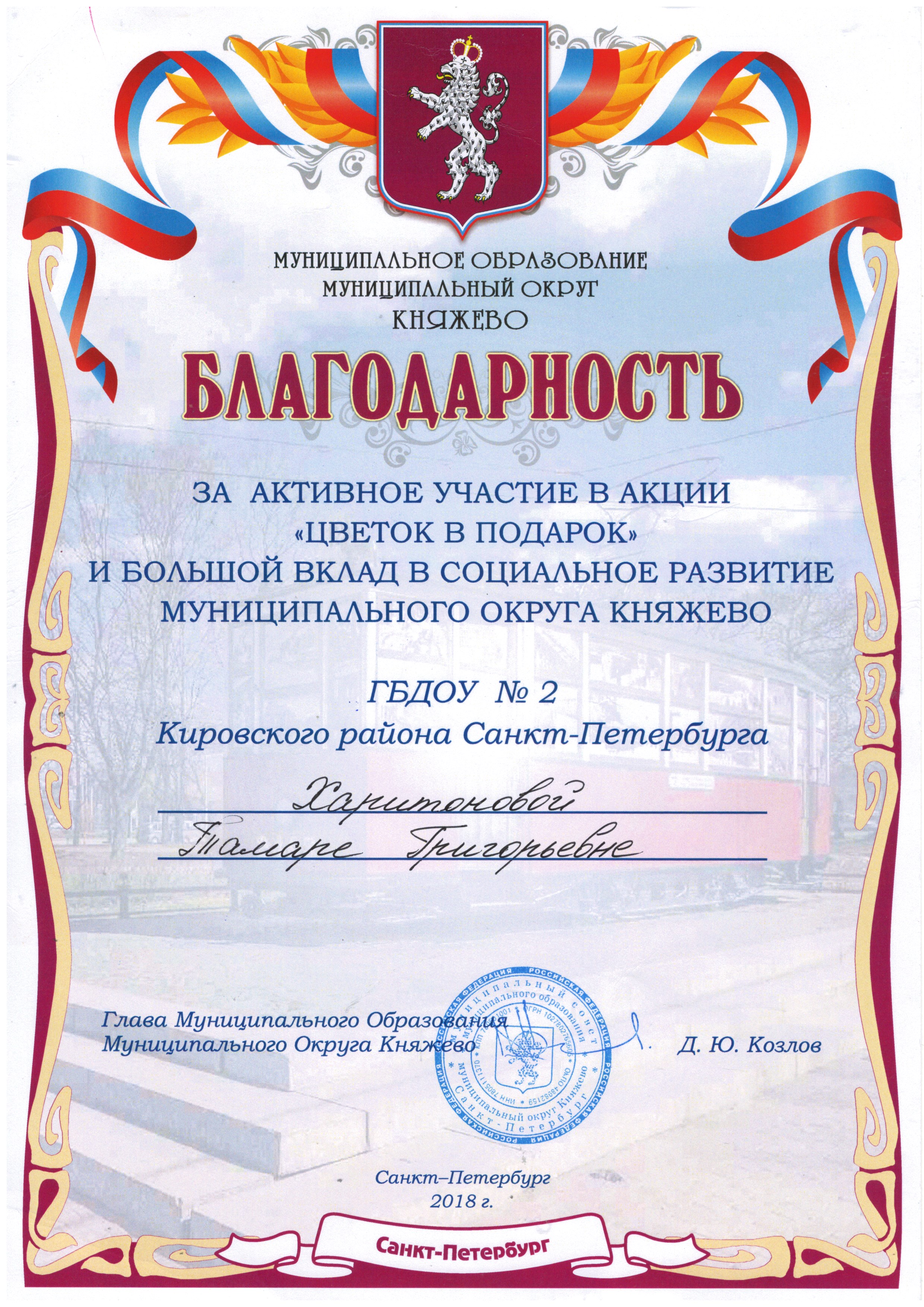 2018 - благодарность от главы муниципального образования муниципального округа Княжево Д.Ю. Козлова за активное участие в акции «Цветок в подарок» и большой вклад в социальное развитие муниципального округа Княжево