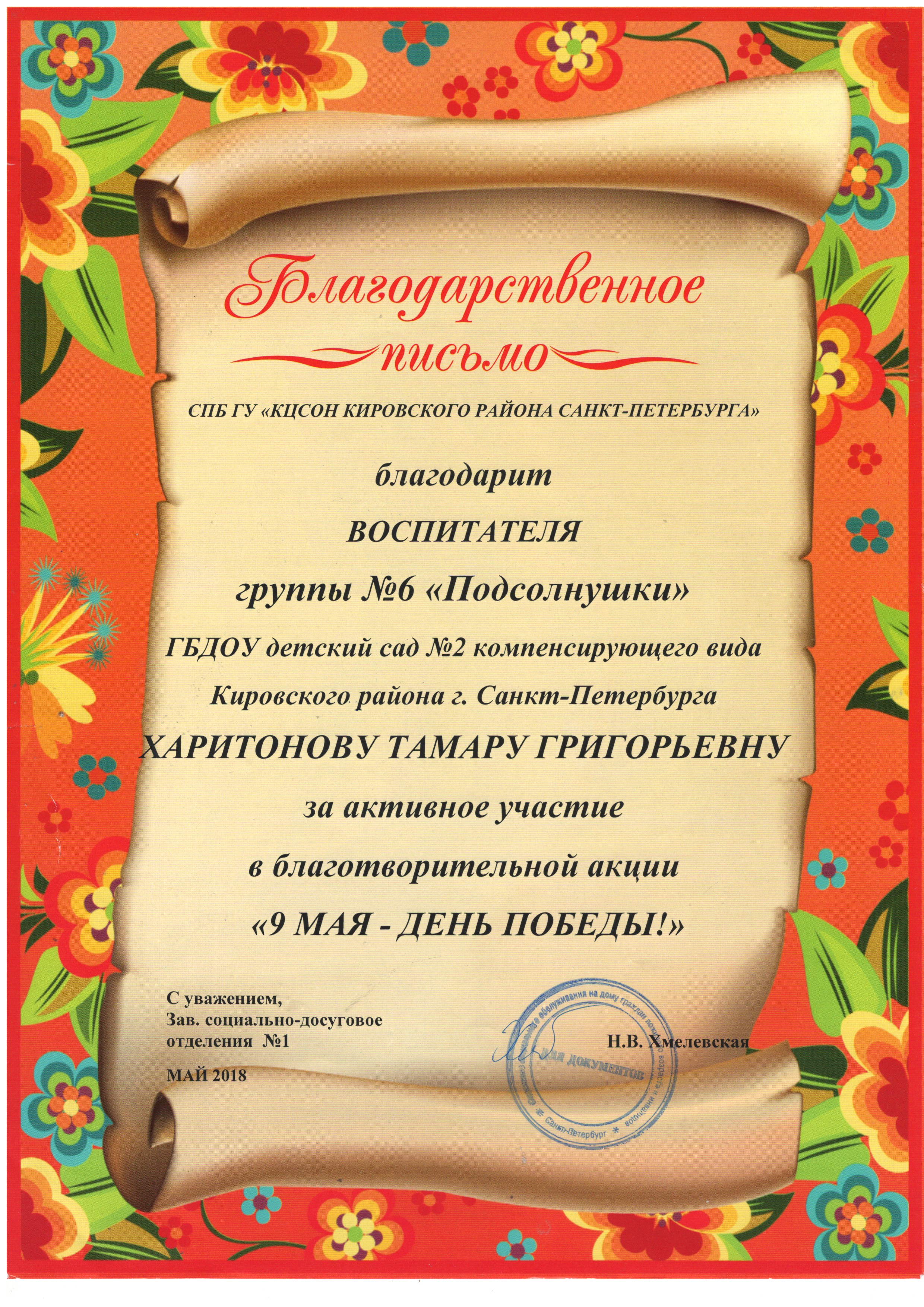 05.2018 - благодарственное письмо от СПБ ГУ «КЦСОН Кировского района Санкт-Петербурга» за активное участие в благотворительной акции «9 МАЯ – ДЕНЬ ПОБЕДЫ»