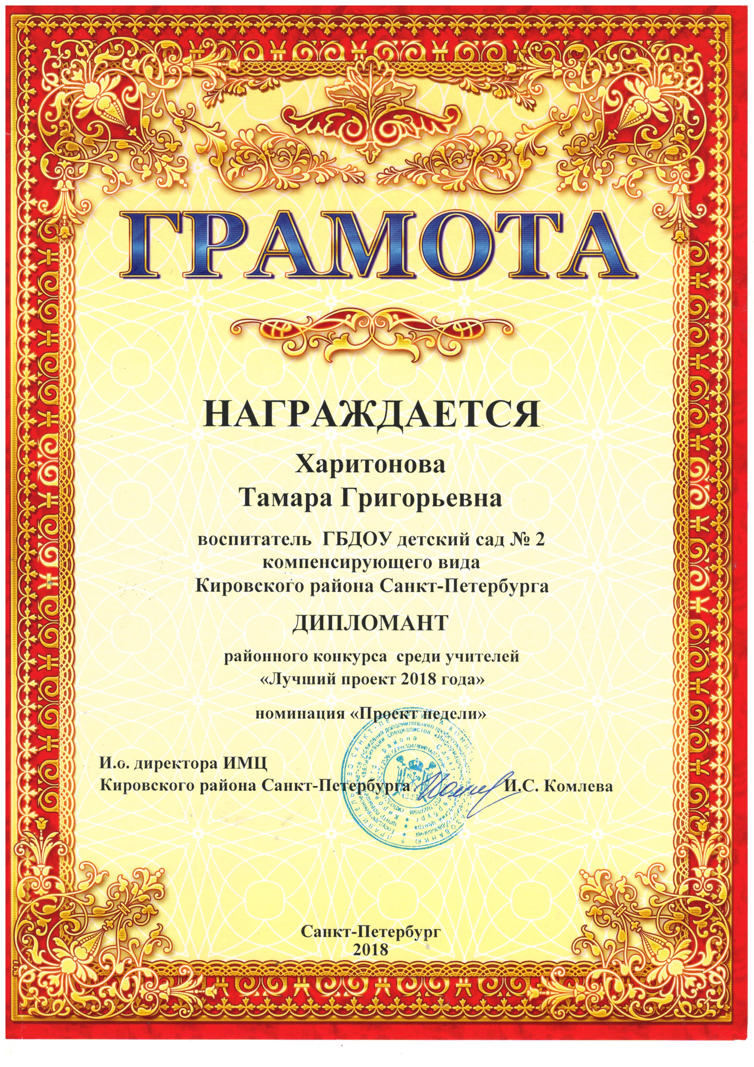 2018 - дипломант районнного конкурса среди учителей «Лучший проект 2018 года» номинация «Проект недели», ИМЦ Кировского района