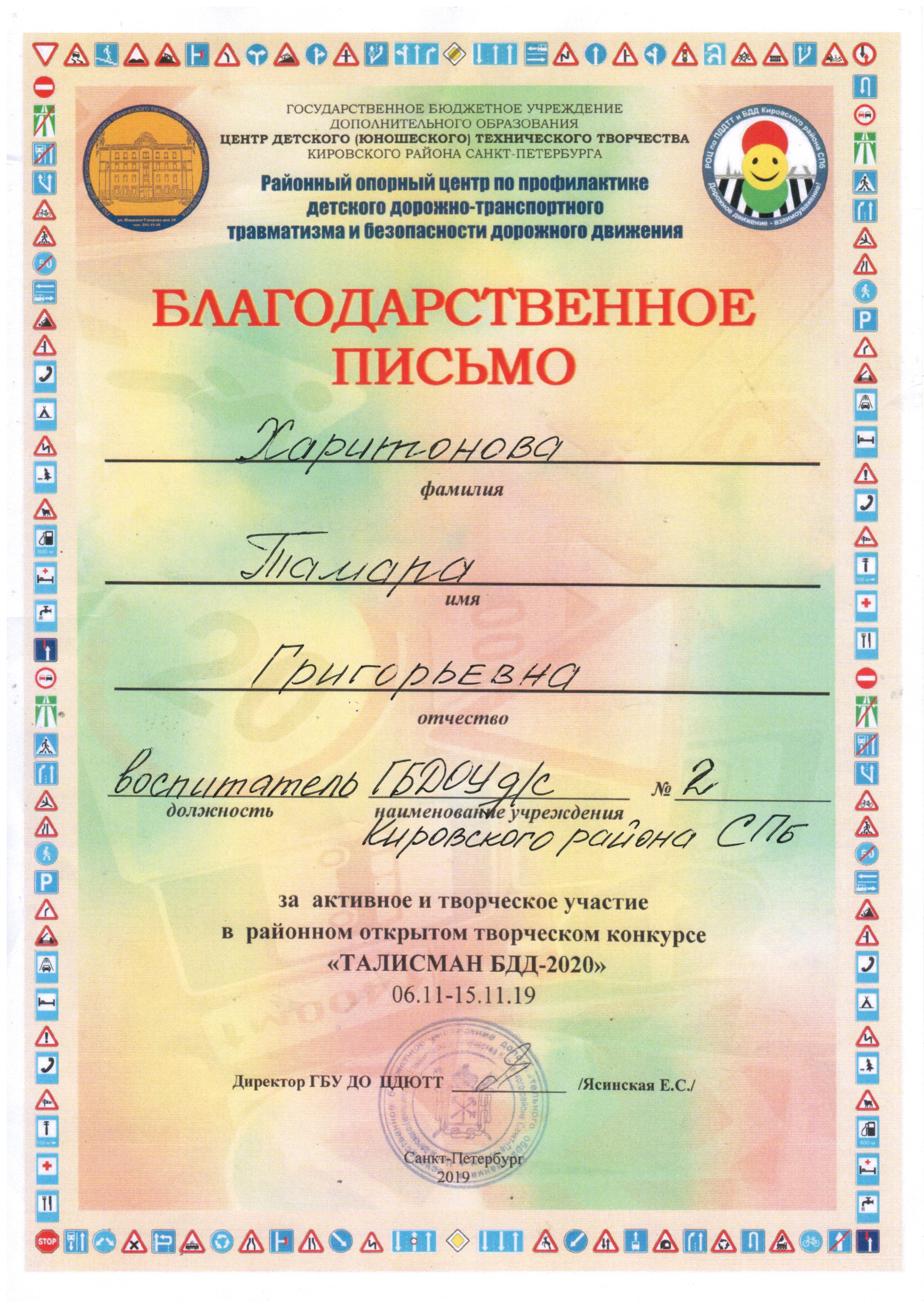 06.11-15.11.2019 - благодарственное письмо от ГБУ ДО ЦДЮТТ Районного опорного центра по профилактике детского дорожно-транспортного травматизма и безопасности дорожного движения за активное и творческое участие в районном открытом творческом конкурсе «ТАЛИСМАН БДД-2020»