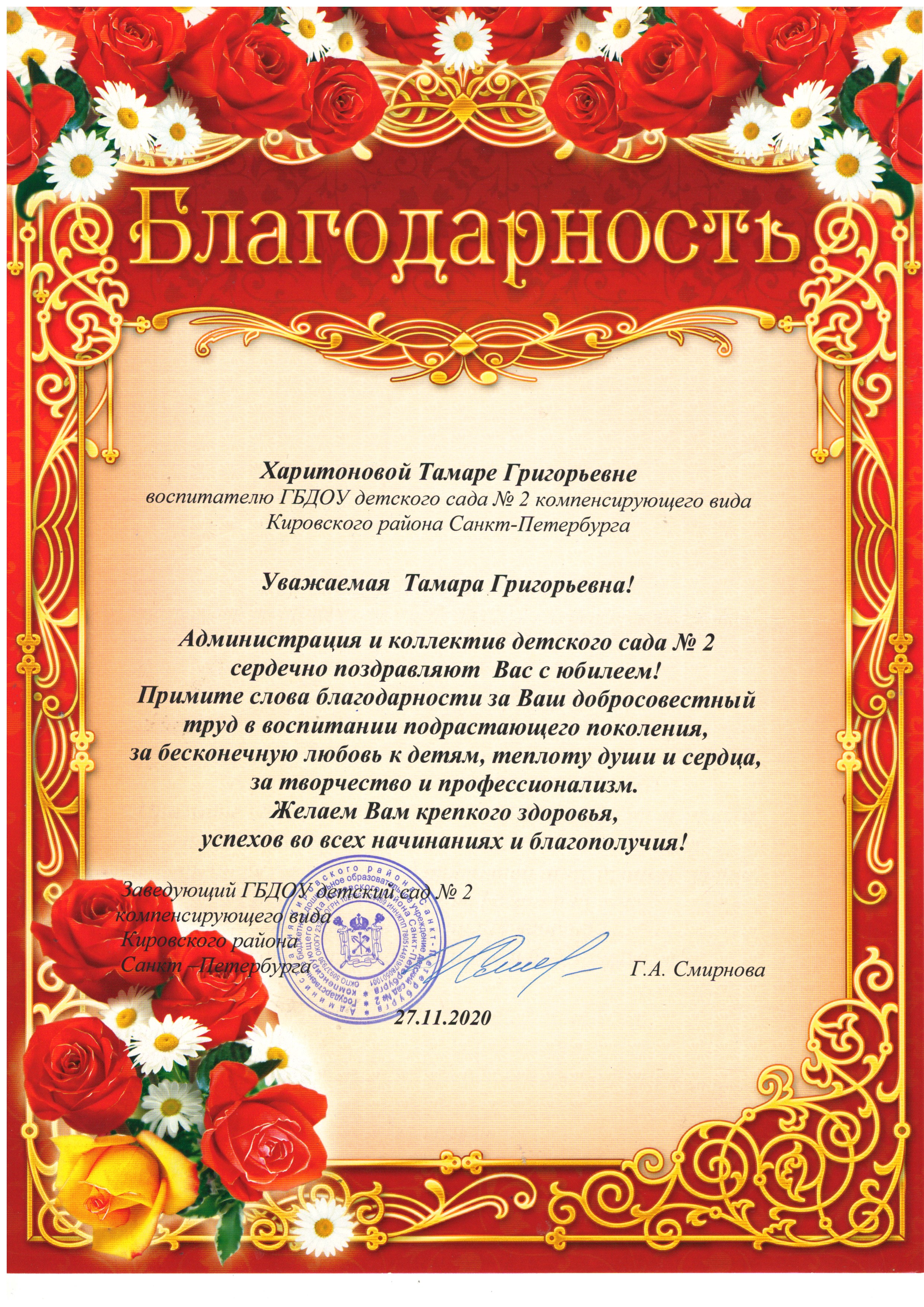 27.11.2020 - благодарность от заведующей ГБДОУ детский сад № 2 компенсирующего вида Кировского района Г.А. Смирновой за добросовестный труд в воспитании подрастающего поколения, за бесконечную любовь к детям, теплоту души и сердца, за творчество и профессионализм
