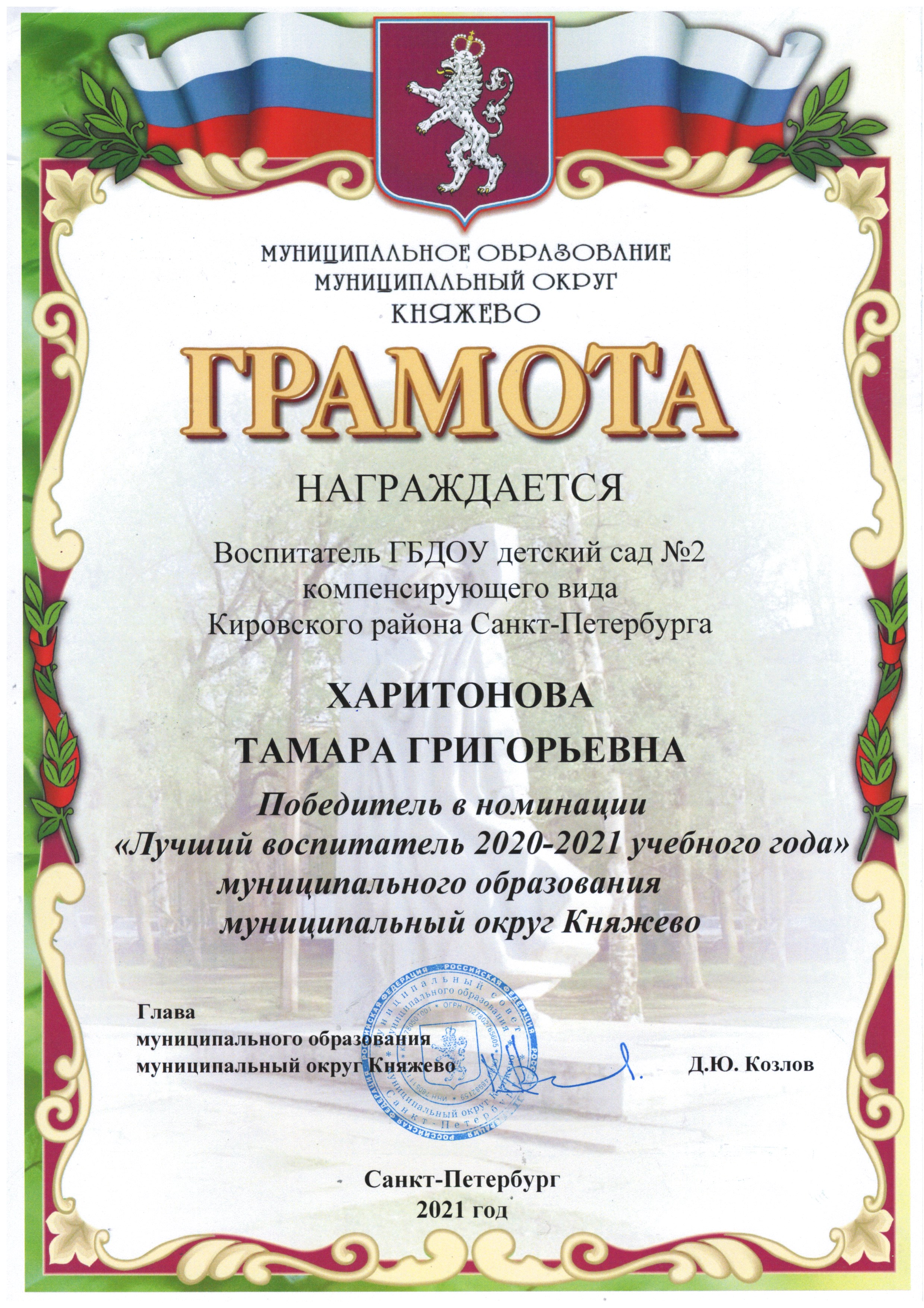 2021 - победитель в номинации «Лучший воспитатель 2020-2021 учебного года», МОМО Княжево