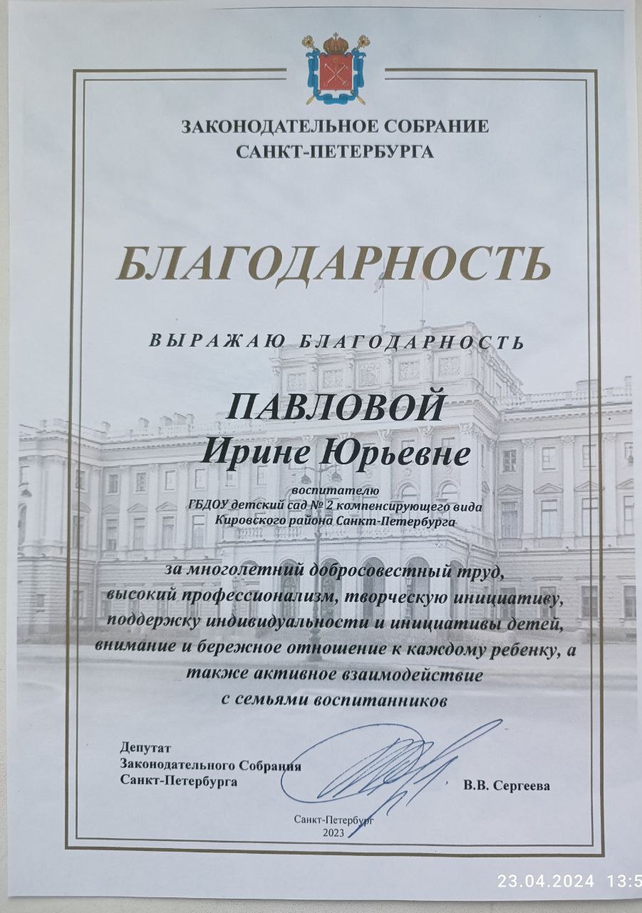 Благодарность Законодательного собрания СПБ , 2023 год