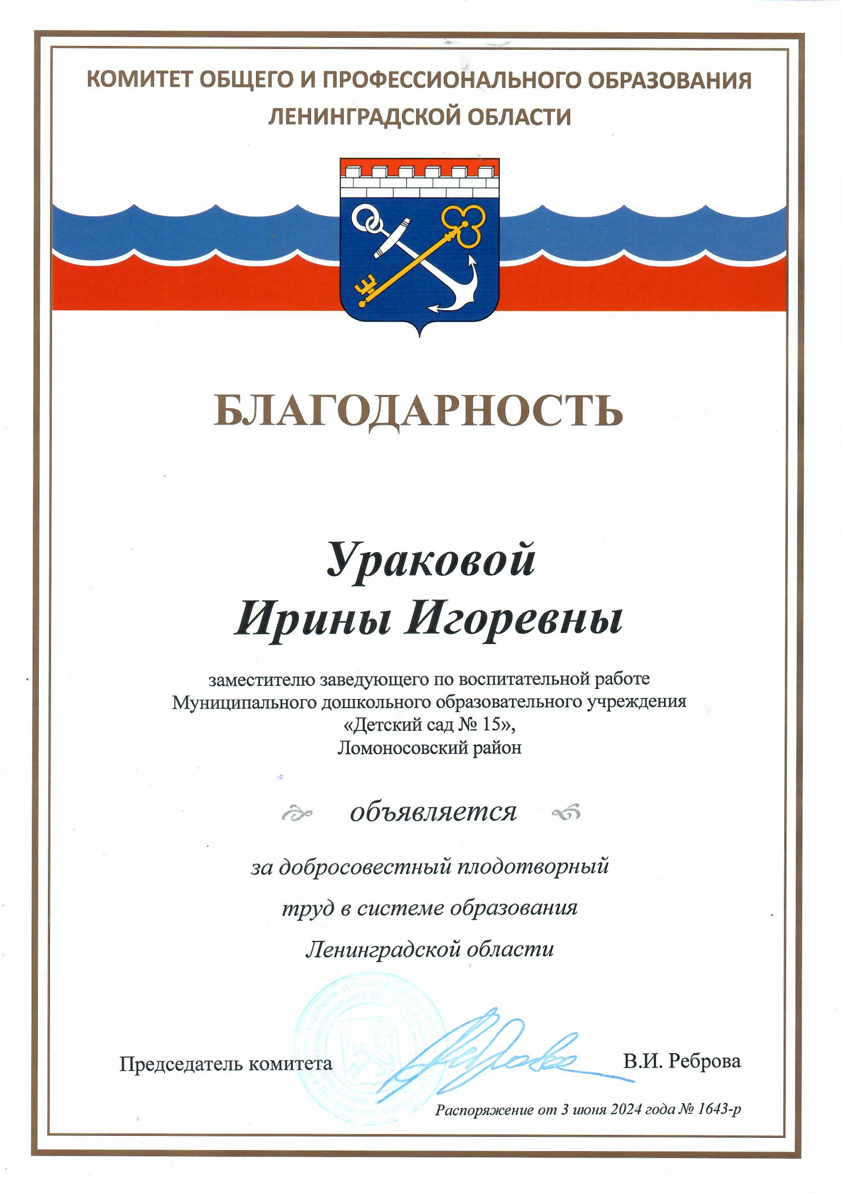 2024 г. - Благодарность Комитета общего и профессионального образования Ленинградской области за добросовестный плодотворный труд в системе образования Ленинградской области
