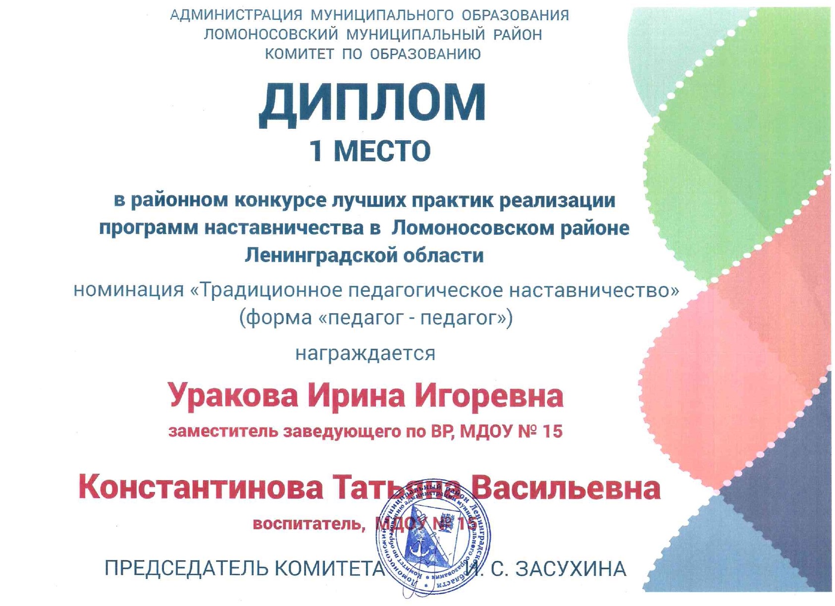 - Районный конкурс лучших практик реализации программ наставничества в Ломоносовском районе Ленинградской области, победитель