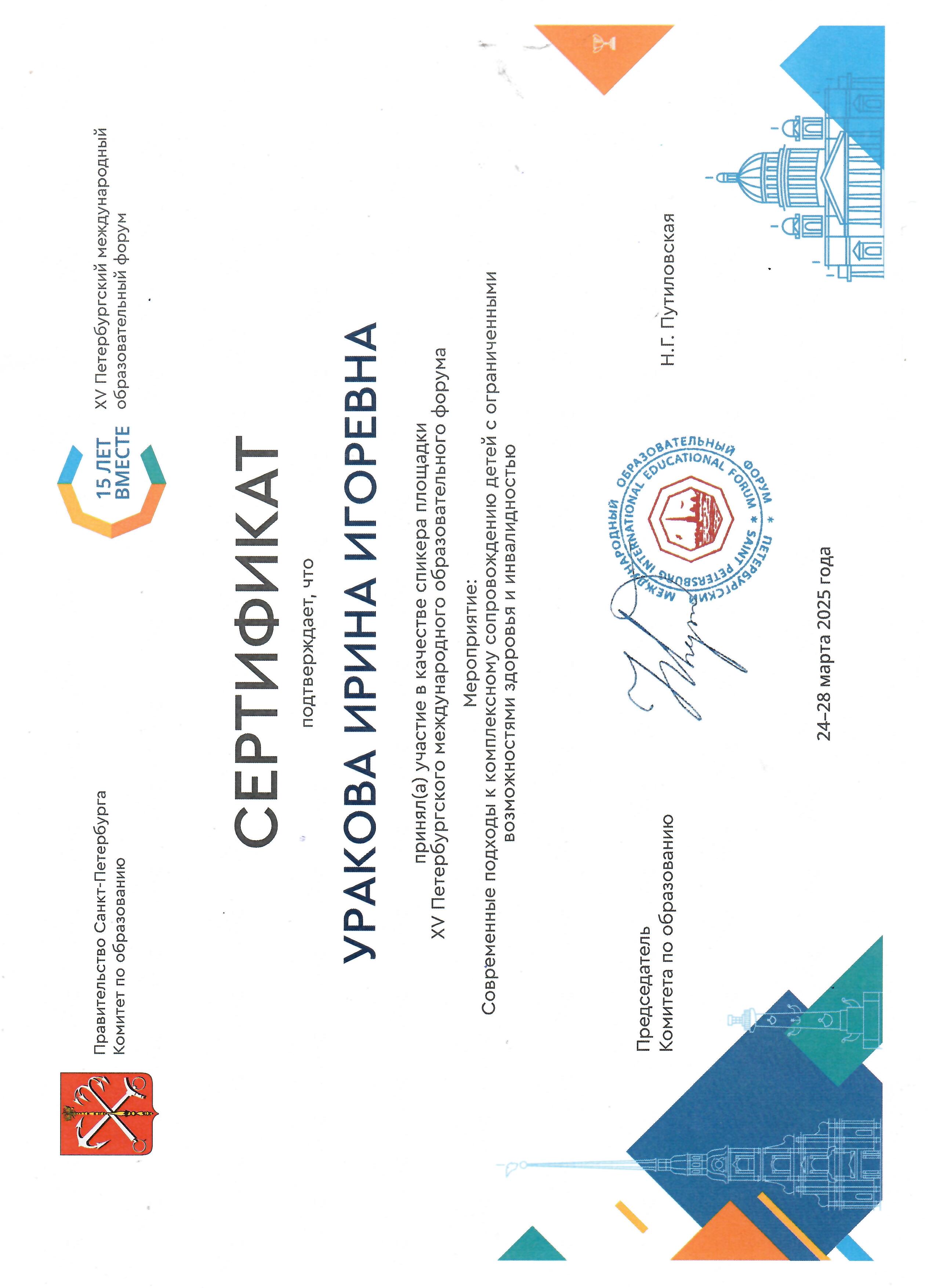 - XV Петербургский международный образовательный форум, семинар "Современные подходы к комплексному сопровождению детей с ограниченными возможностями здоровья и инвалидностью", спикер