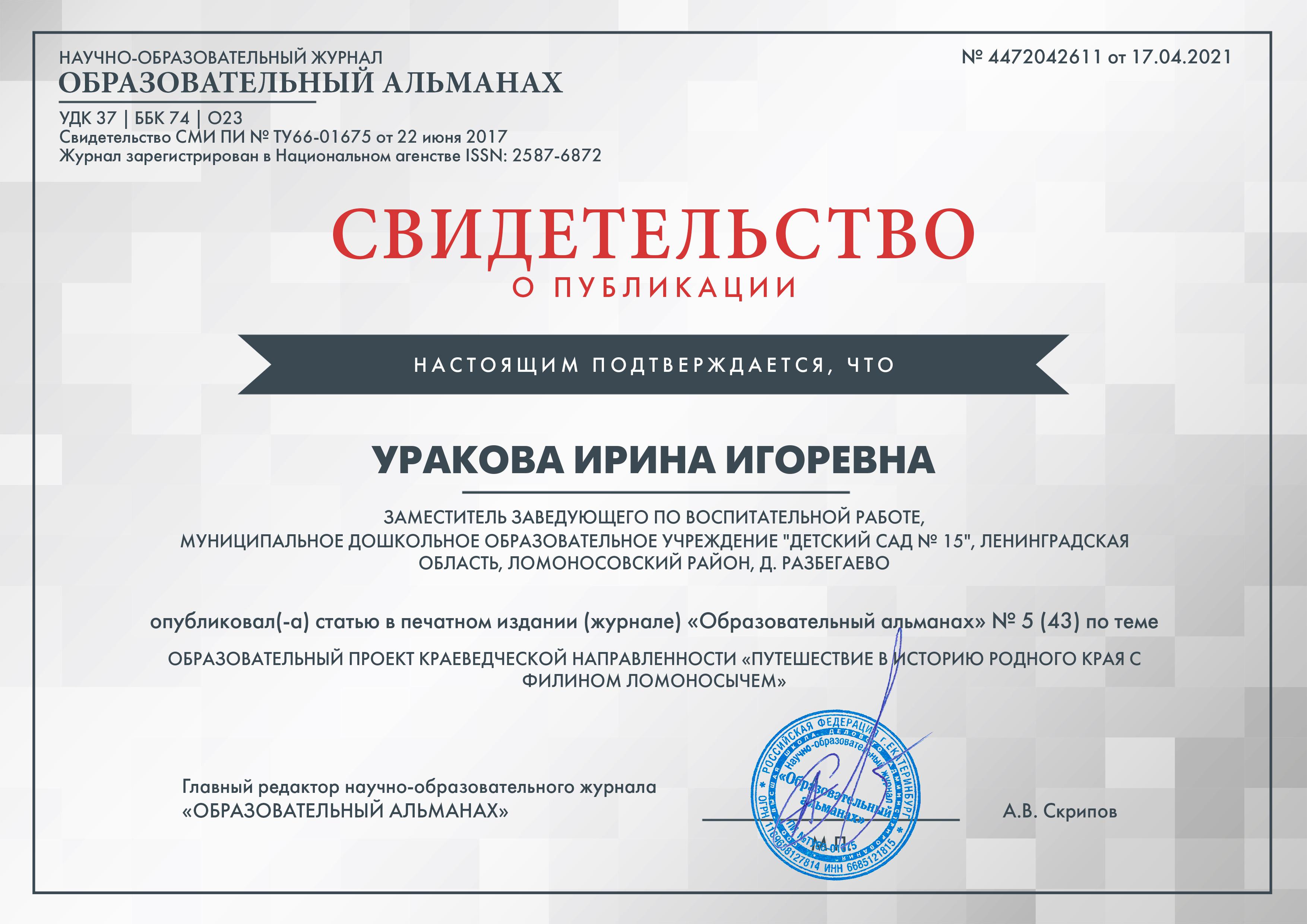 - Публикация в научно-образовательном журнале "Образовательный альманах" – 2021. – № 5 (43): Образовательный проект краеведческой направленности «Путешествие в историю родного края с филином Ломоносычем, свидетельство о публикации