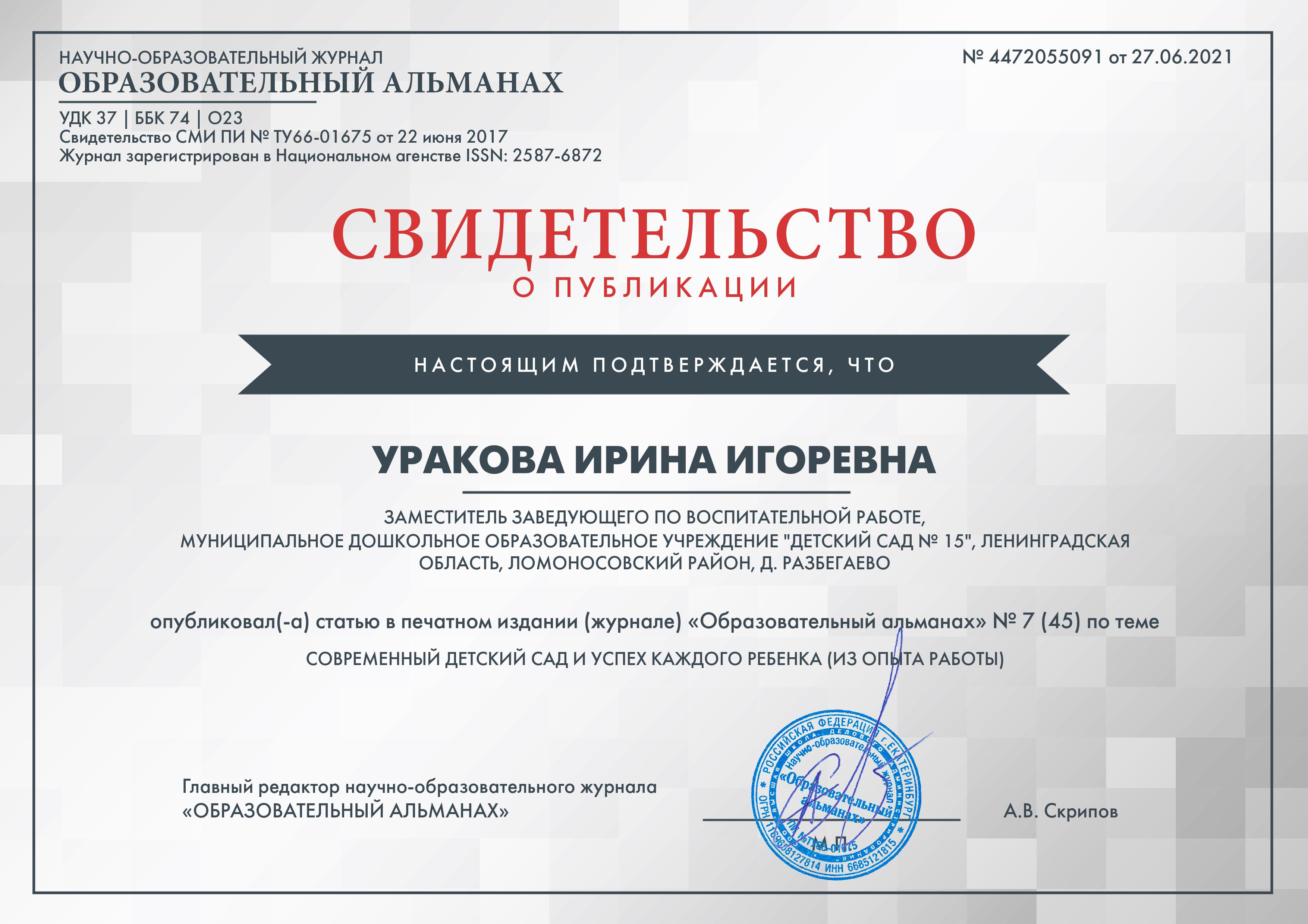 - Публикация в научно-образовательном журнале "Образовательный альманах" – 2021. – № 7 (45): Современный детский сад и успех каждого ребёнка (из опыта работы), свидетельство о публикации
