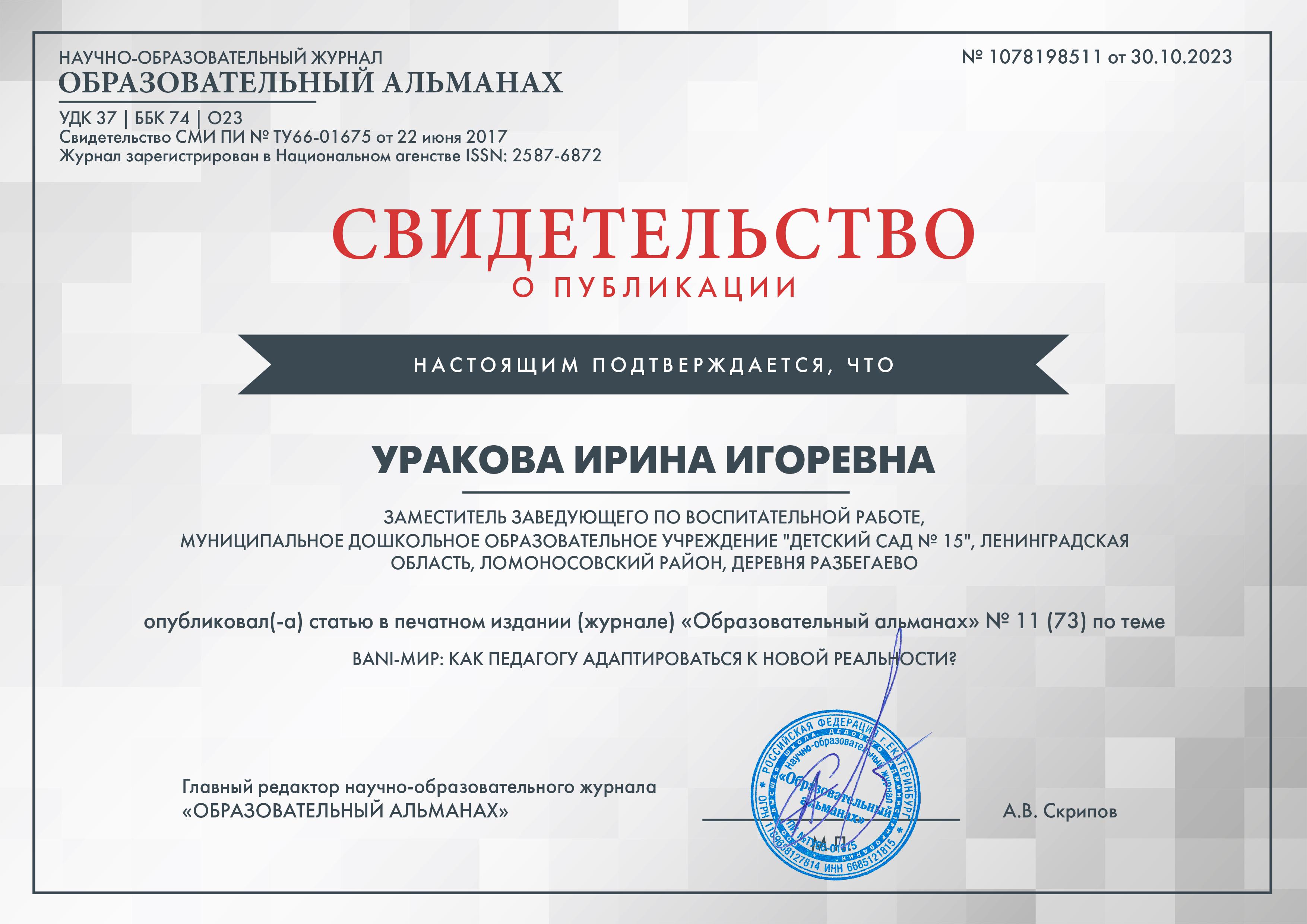- Публикация в научно-образовательном журнале "Образовательный альманах"– 2023. − № 11 (73). Часть 4: BANI-мир: как педагогу адаптироваться к новой реальности?, свидетельство о публикации