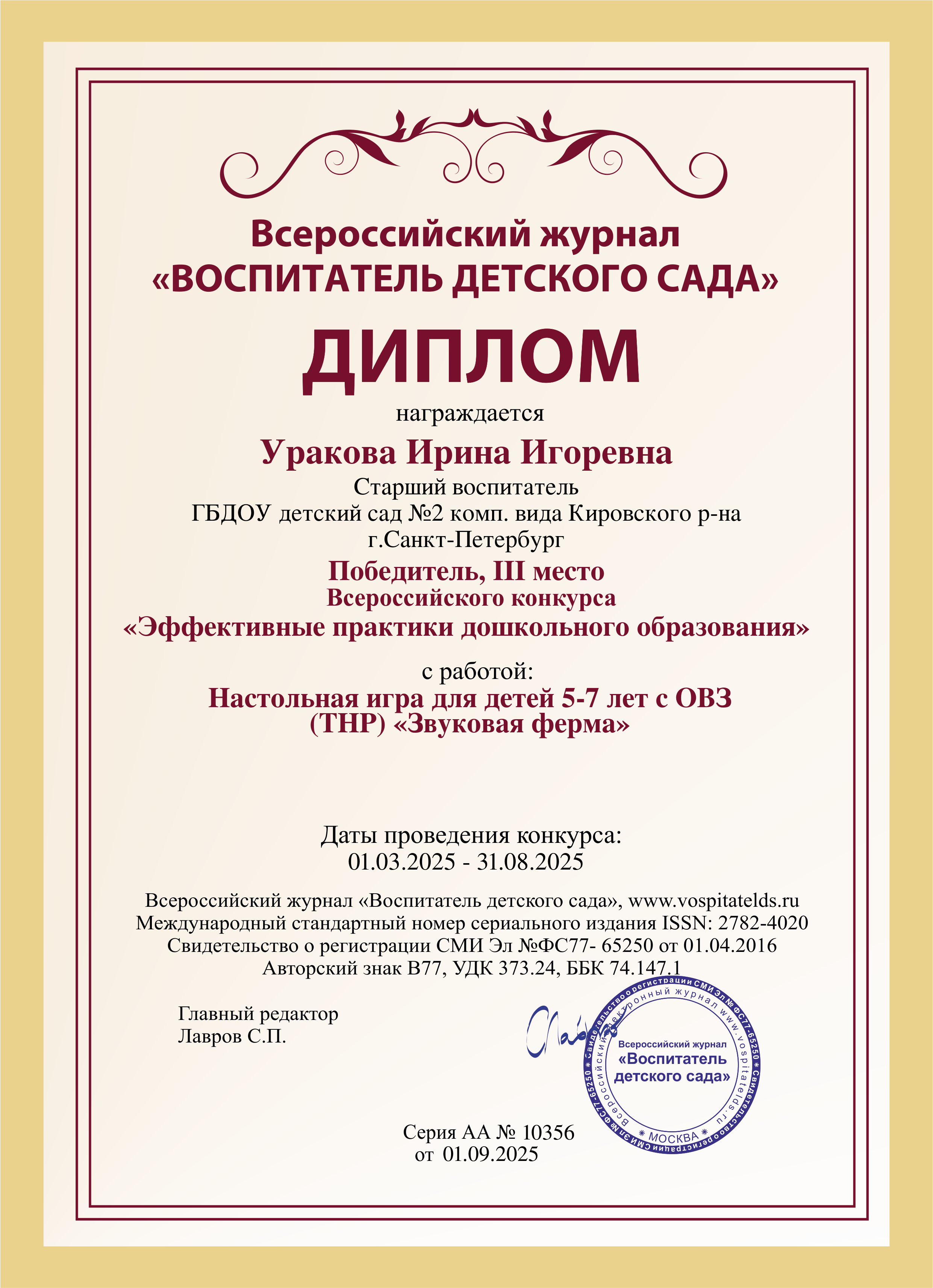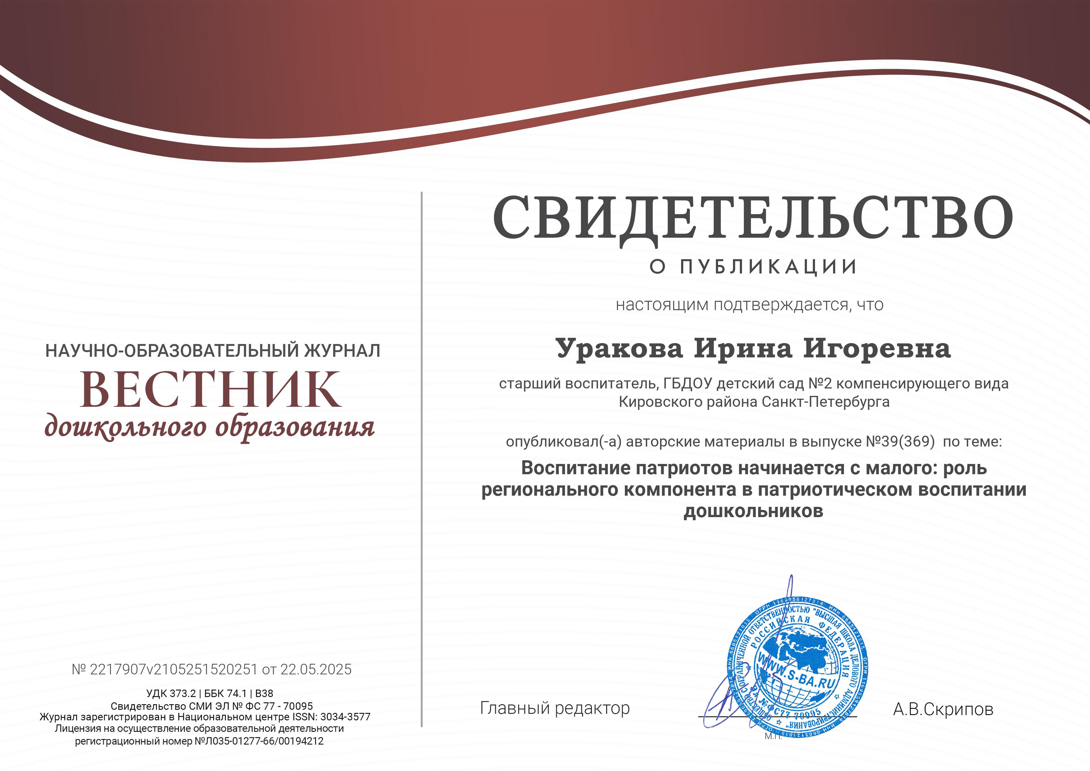 - Публикация в научно-образовательном журнале "Вестник дошкольного образования" – 2025. – № 39 (369): Воспитание патриотов начинается с малого: роль регионального компонента в патриотическом воспитании дошкольников, свидетельство о публикации
