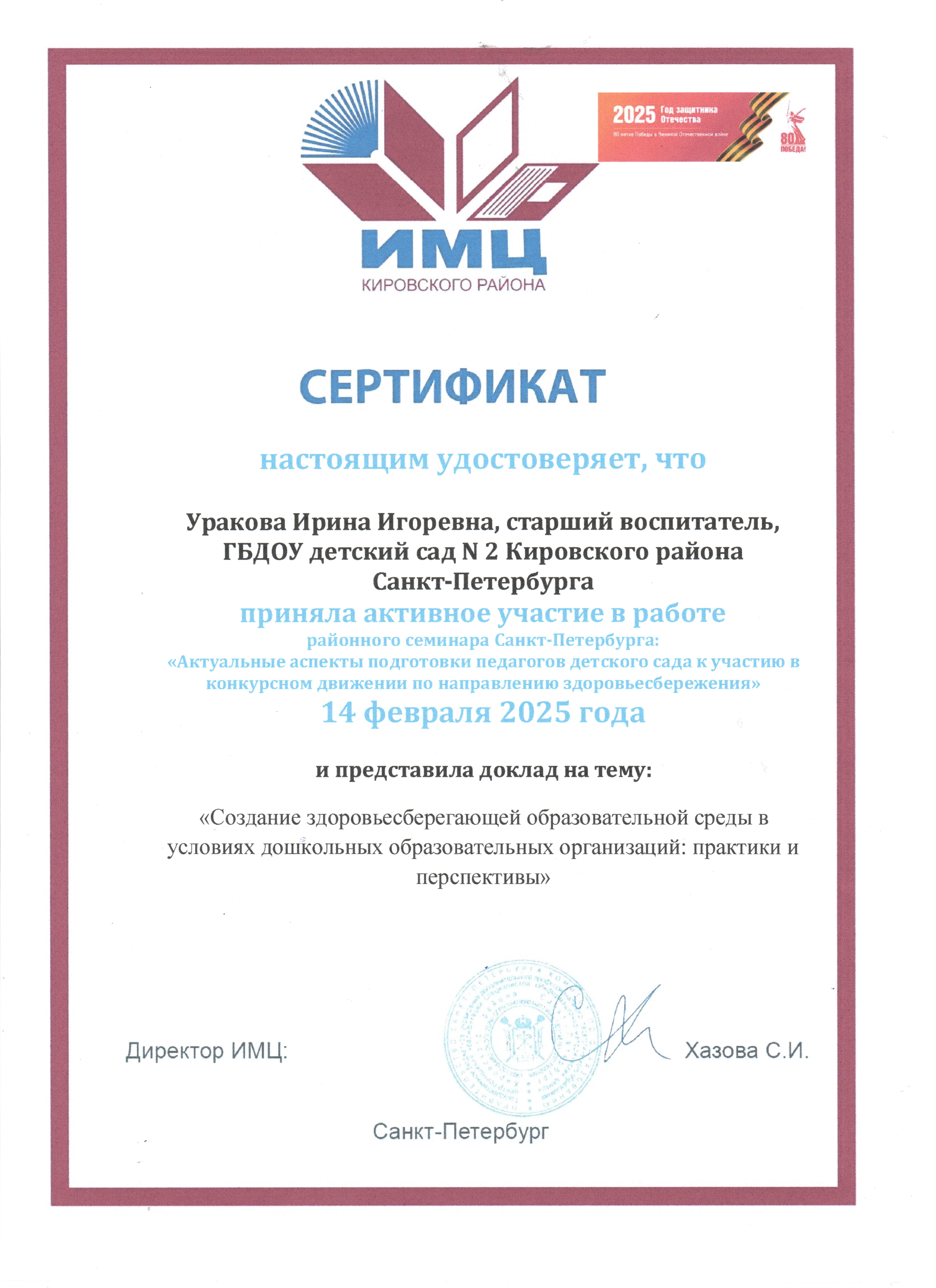 - Районный семинар Санкт-Петербурга "Актуальные аспекты подготовки педагогов детского сада к участию в конкурсном движении по направлению здоровьесбережения", выступление с докладом "Создание здоровьесберегающей образовательной среды в условиях дошкольных образовательных организаций: практики и перспективы"