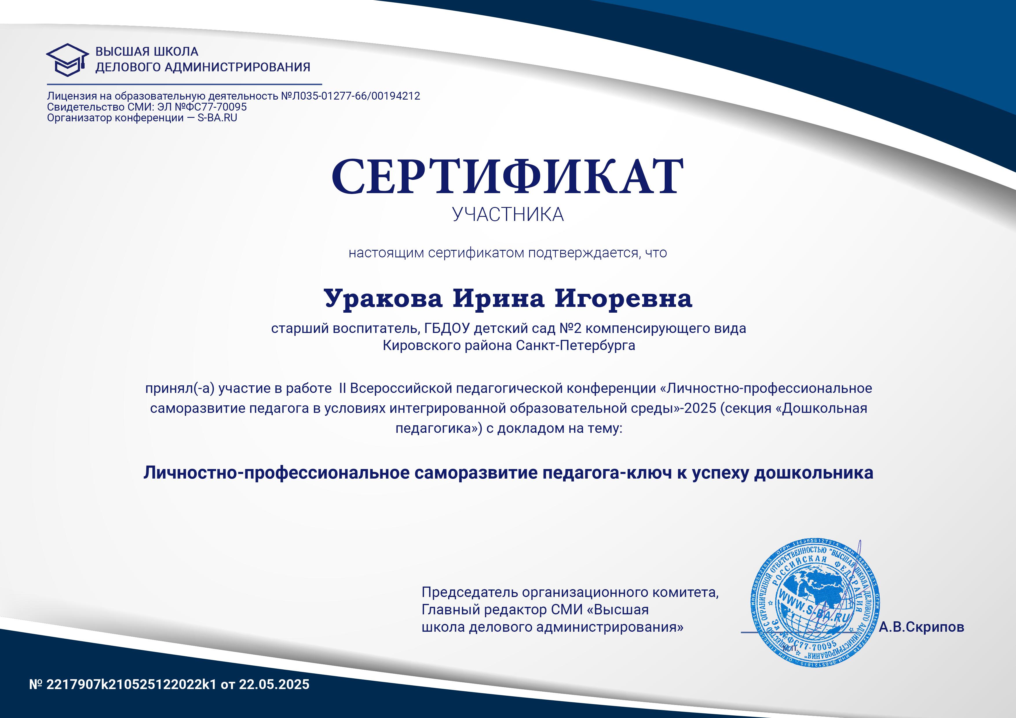 - II Всероссийская педагогическая конференция "Личностно-профессиональное саморазвитие педагога в условиях интегрированной образовательной среды-2025", доклад на тему: "Личностно-профессиональноесаморазвитие педагога - ключ к успеху дошкольника"