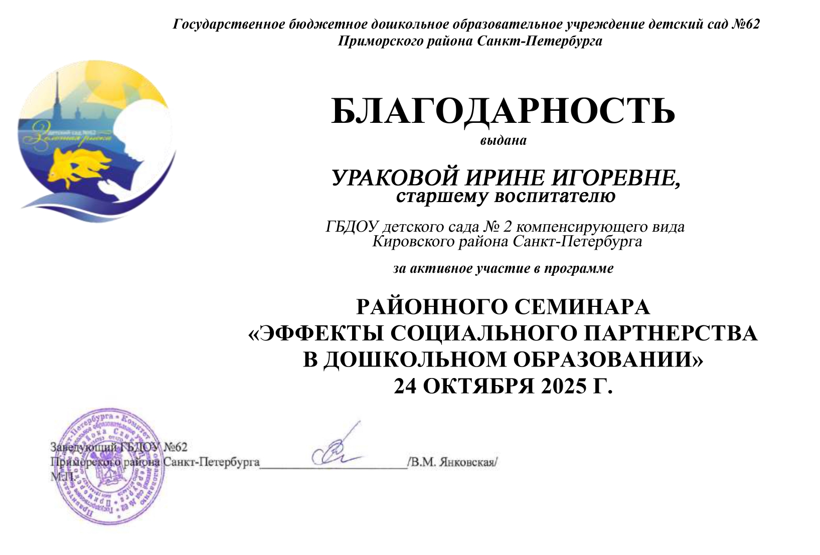 - Районный семинар (Приморский район Санкт-Петербурга) "Эффекты социального партнёрства в дошкольном образовании", участие (стендовый доклад)