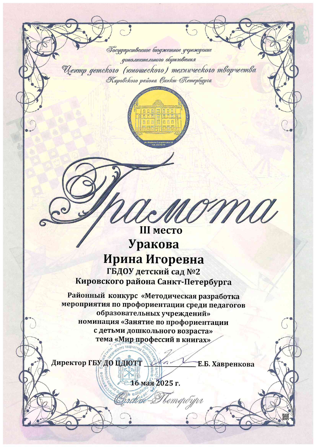 - Районный профориентационный конкурс среди педагогов образовательных учреждений Кировского района Санкт-Петербурга «Методическая разработка мероприятия по профориентации», 3 место